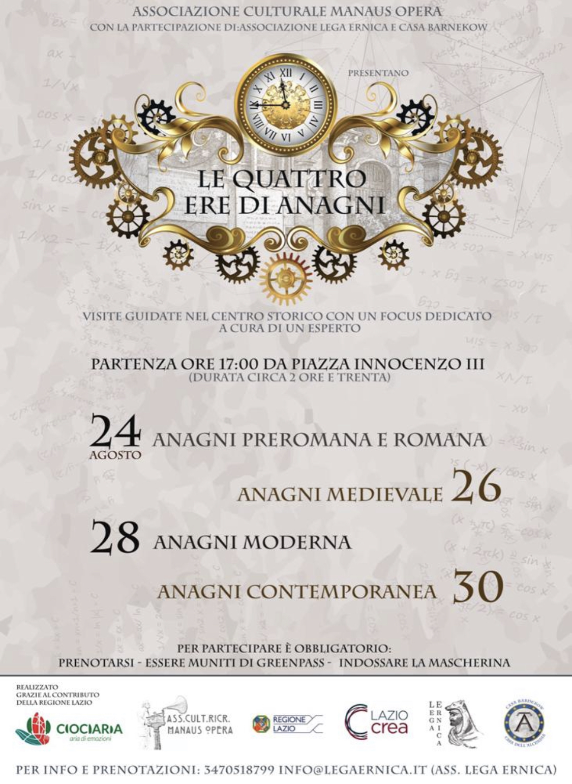 Ogni tour sarà caratterizzato da un periodo storico definito, età romana, medievale, moderna e contemporanea, tutti quei periodi di cui Anagni fu interprete principale. I percorsi, accompagnati dalle bravissime guide turistiche di Lega Ernica, partiranno alle ore 17:00 da Piazza Innocenzo III, da un punto di raccolta segnalato da una postazione di Lega Ernica, attraverseranno la città e sveleranno i suoi angoli nascosti, fino a concludersi ciascuno con un focus su un argomento specifico (una conferenza di circa 40 minuti) a cura dell’archeologo Guglielmo Viti