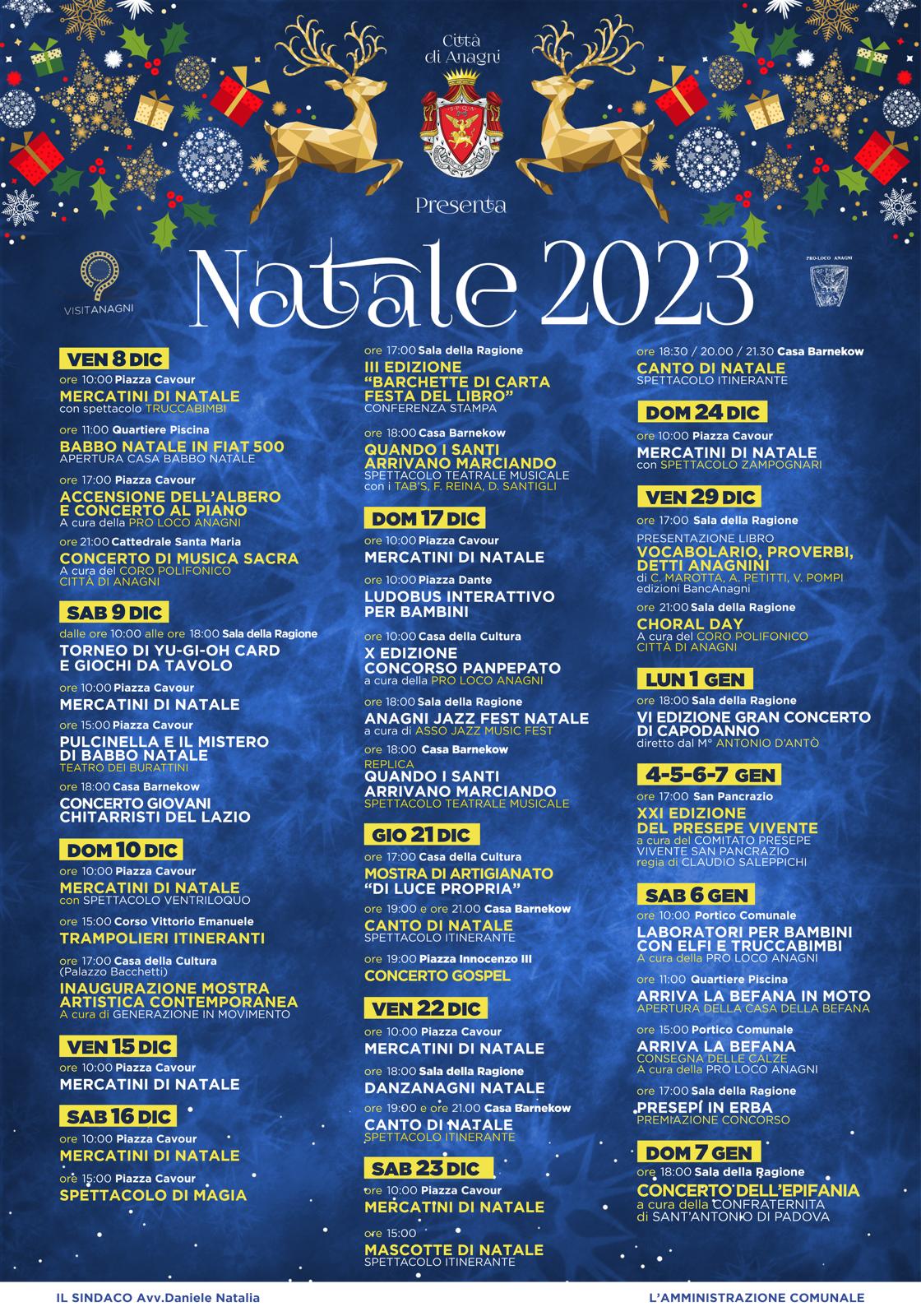 Dall'8 Dicembre la magia del Natale torna ad Anagni: un manifesto lungo 1 intero mese a partire da Venerdì 8 Dicembre, con la tradizionale accensione dell'albero di Natale a Piazza Cavour, quest'anno accmpagnato da un concerto al piano, fino al 7 Gennaio con il concerto della Confraternita di San'Antonio da Padova.