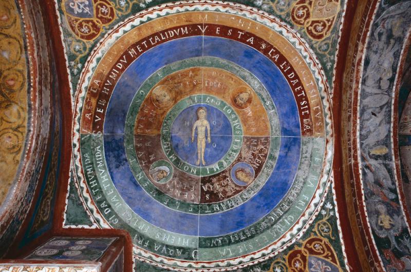 Tra le moltissime raffigurazioni che ancor oggi incantano grandi e piccini, qui citeremo almeno quella della seconda volta del Ciclo Scientifico ove l'uomo, rappresentato nella sua perfezione in quanto creato a immagine e somiglianza di Dio, si trova al centro di un duplice sistema circolare simbolo del Ciclo della vita umana (microcosmo) e della natura (mundus): l'universo si fonda sulla proporzione dei 4 elementi (terra, acqua, aria e fuoco) in rapporto costante e immutabile così da formare un unico 'tutto';